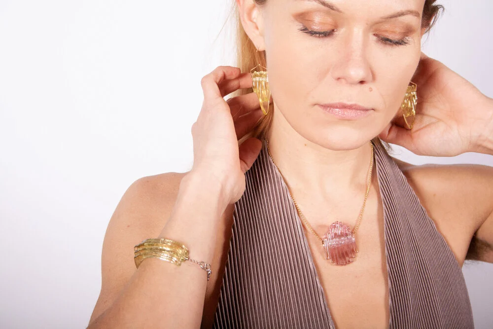 Our line of Sculptural Wearables plays with form and light, using repetition to create their 3 Dimensional forms. All Kinetic glass wearables arrive in a customized, cushion-hinged box for the safe sale and storage of each piece.